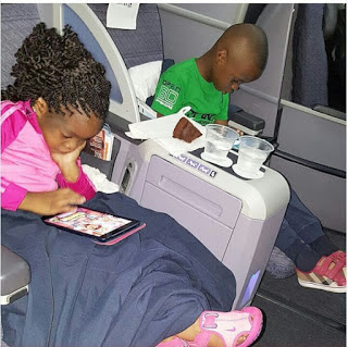The comedian shared a photo of his kids lounging at the business class on their flight to the United States.